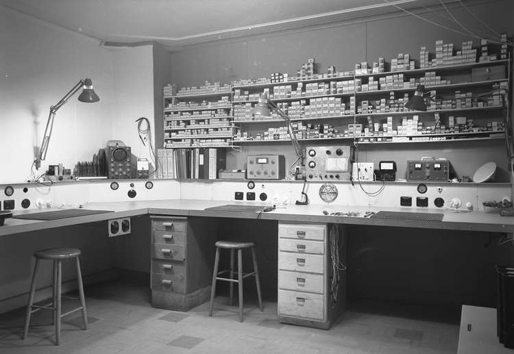 Text till bilden: "Tele Radio. Inge Dahlgren. Interiör. Verkstad.
