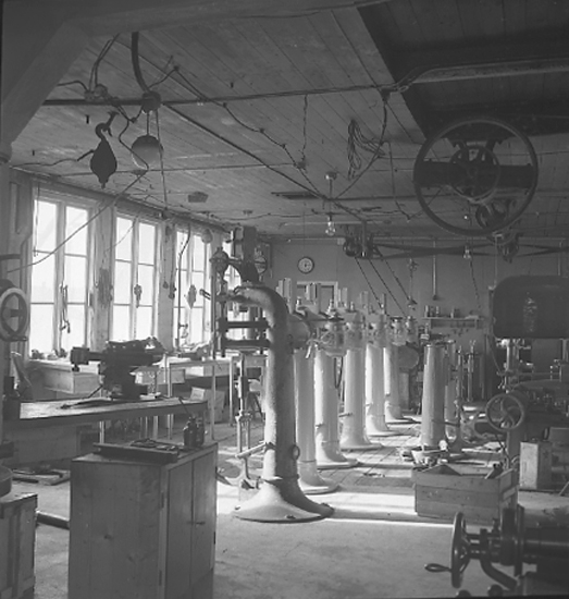 Text till bilden: "Bergmans Mekaniska verkstad. Falsmaskiner i smedjan. 1945.09.30".