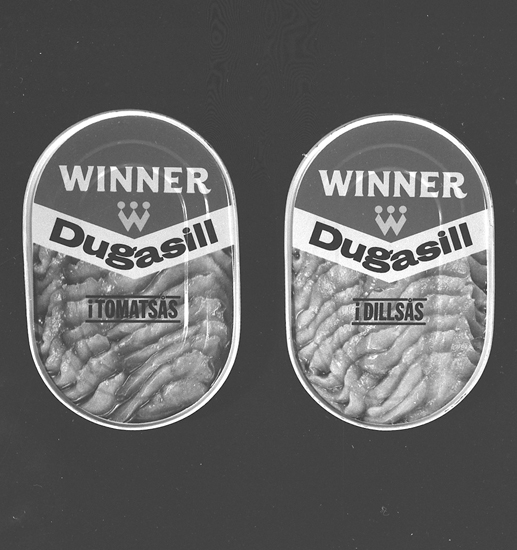 Titel: Text till bilden: "Lysekil. Skandia Konservfabrik. Burkar. 1965.12"