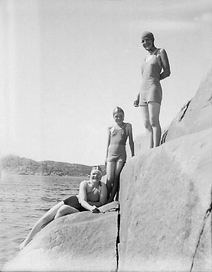 Enligt senare noteringar: "Tre badflickor: systrarna Anna, Valborg och Judith Johansson vid "vadräckan" i Slävik".