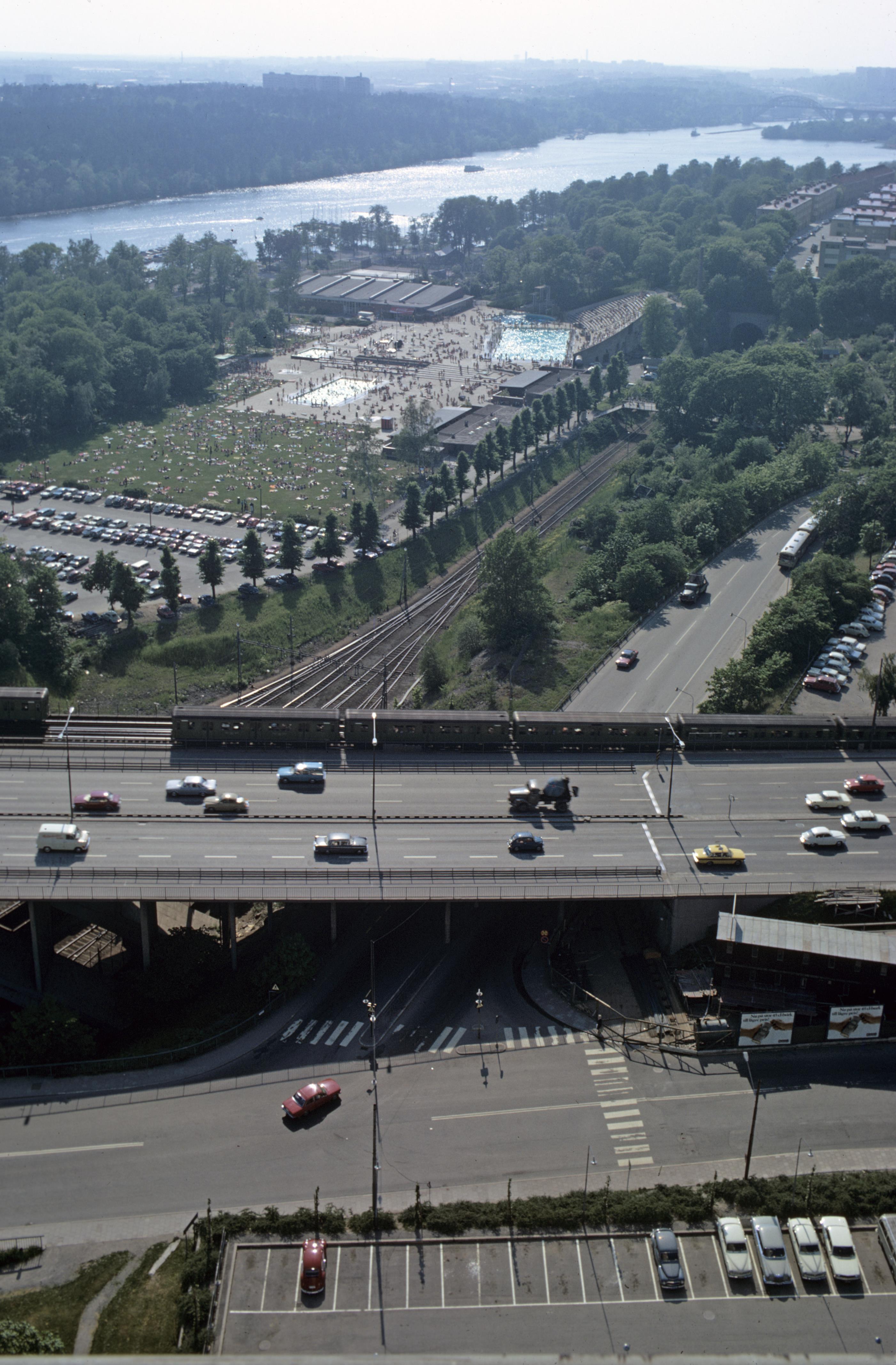 Nynäsvägen. Eriksdalsbadet i bakgrunden. Bilden troligen från början av 1970-talet.