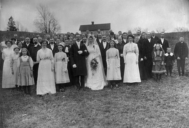 Brudpar med gäster framför gård på landsbygden