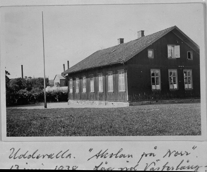 Handskrivet på bildens framsida: "Uddevalla. "skolan på norr" 13 juni 1938. Låg vid Västerlånggatan".