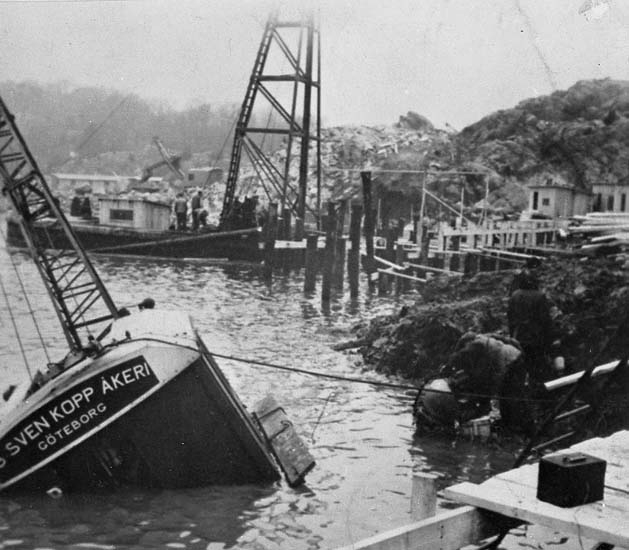 Enl. tidigare noteringar: "Från byggandet av Uddevallavarvet. Man hade byggt en väg vid sjökanten som brast för tunga maskiner, vilka användes vid schaktningsarbete.