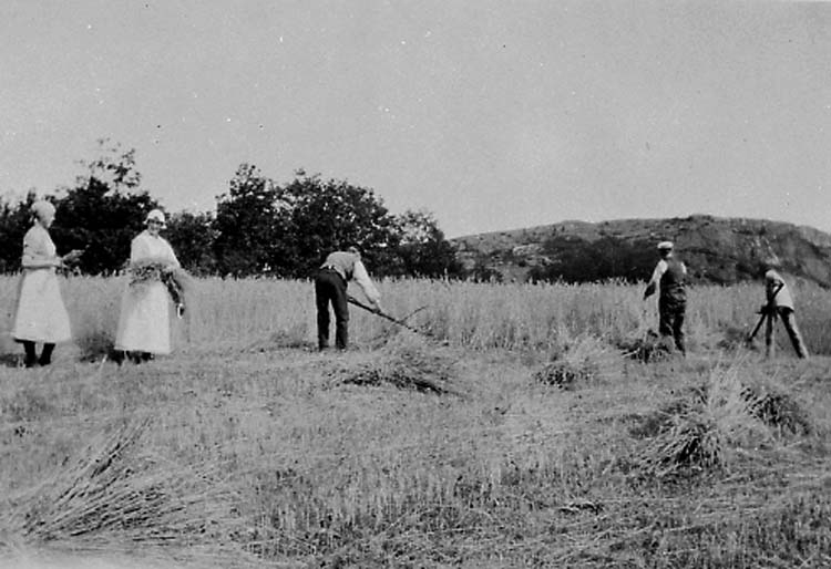 Enligt medföljande text: "Här mejas vete. 1922. Spetz och "stöten" mejar. Linus Spetz och Judit tar upp. Karin, senare min fru "lägger band".