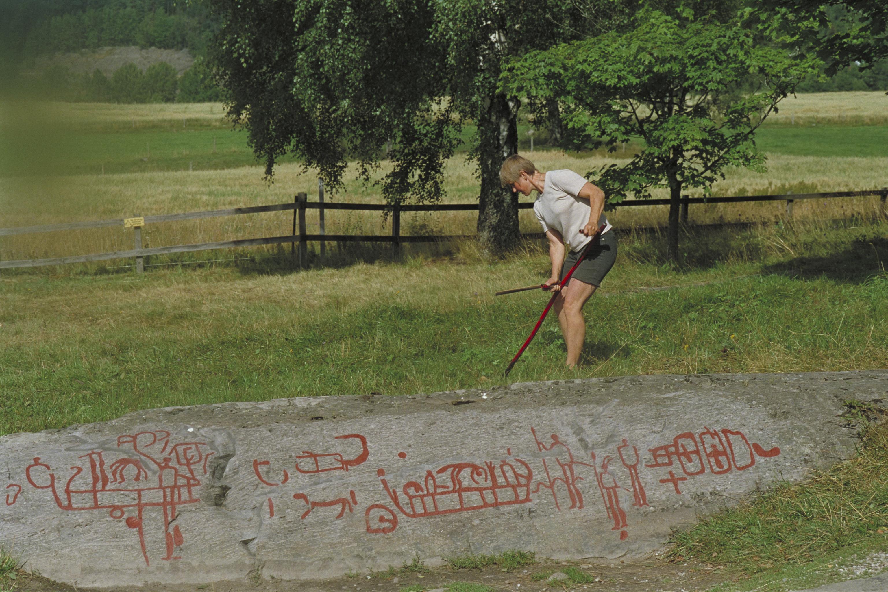 RAÄ-nummer Tisselskog 11:1. Processionshällen. Skepp med voltigörer, människofigurer med spjut och fotsulor.
