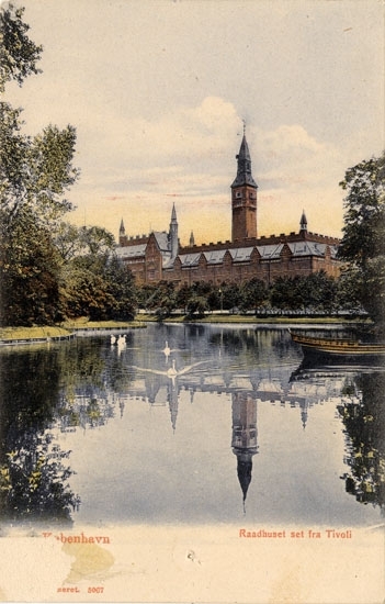 Tryckt text på bilden: "Köbenhavn, Raadhuset set fra Tivoli".