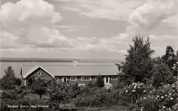 Tryckt text på bilden: "Gyllene Uttern. Nya Hotellet".