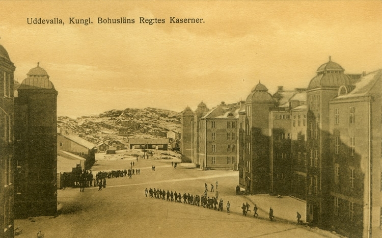 Text på kortet: "Uddevalla. Kungl. Bohusläns Reg:tes Kaserner".