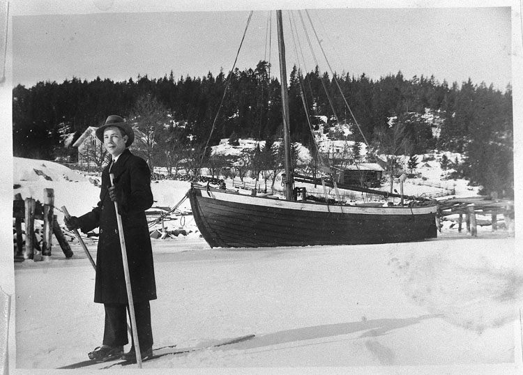 "Nils Strandhag, son till Alexis Johansson. Jakten "Göta" ägd av Alexis Johansson. I bakgrunden till vänster synes A. J:s bostad, Strand, vid Ingalsröd. Repro av foto tillhörande Ernst Blomstrand, Brastad".