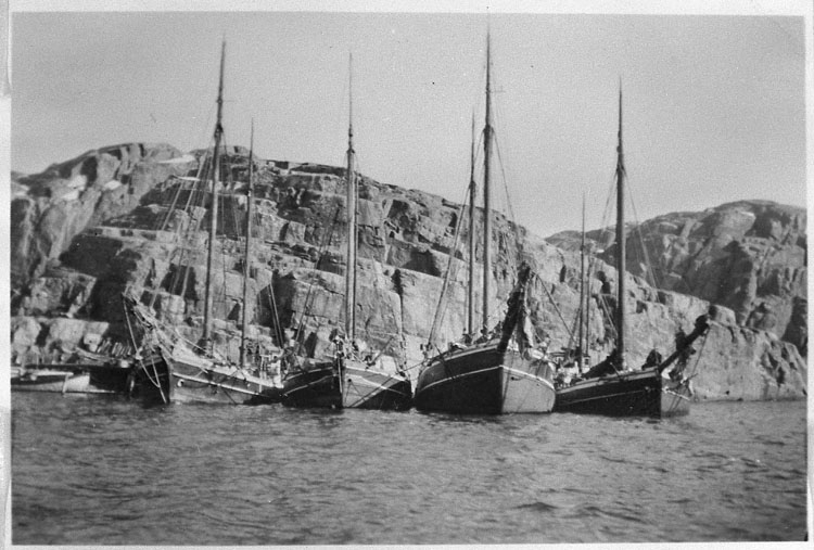 Från höger: kuttern "Alfhild" galeasen "Emma" (150 ton), galeasen "Daga", galeasen "Rita".