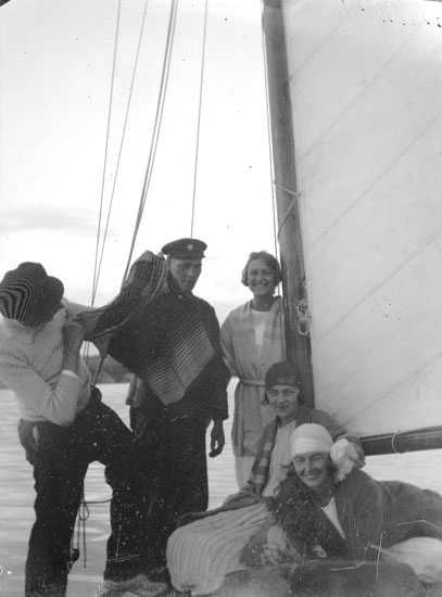 Enl. text i blå bok: "Tre damer och två män på segelbåt"