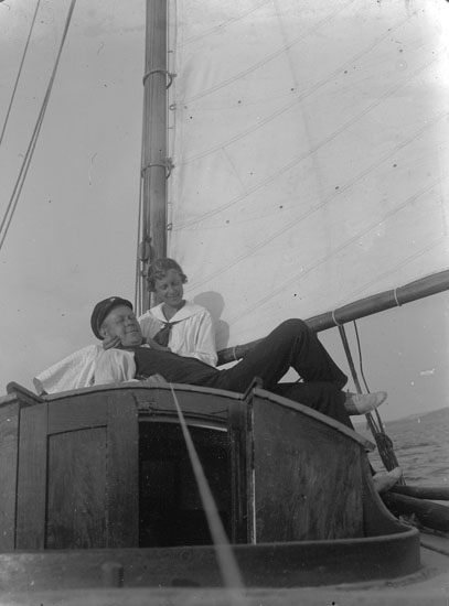 Enl. text i blå bok: "Man och dam på rufftaket, segelbåt."