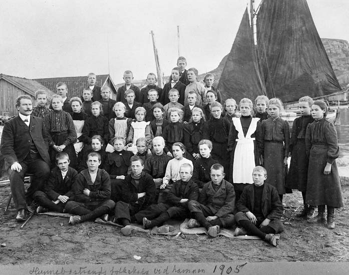 Text som medföljer kortet: "Hunnebostrands folkskola vid hamnen 1905".