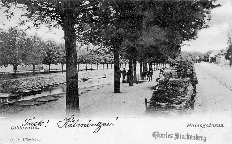 Tryckt text på vykortets framsida: "Uddevalla, Hamngatorna".