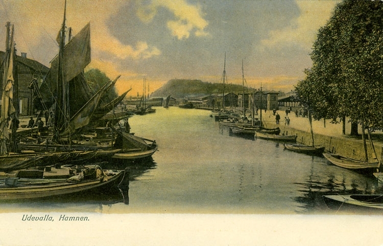 Tryckt text på vykortets framsida: "Uddevalla Hamnen".