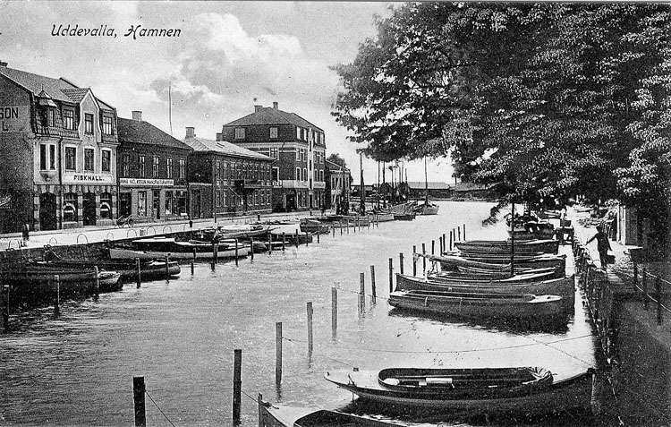 Tryckt text på vykortets framsida: "Uddevalla Hamnen".