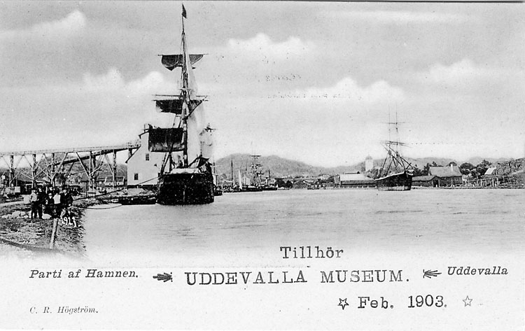 Tryckt text på vykortets framsida: "Parti af Hamnen Uddevalla".