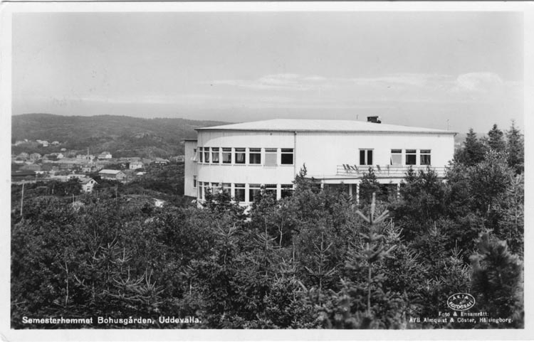 Tryckt text på vykortets framsida: "Semesterhemmet Bohusgården, Uddevalla."