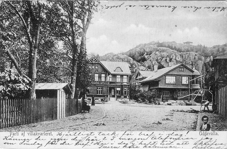Tryckt text på vykortets framsida: "Uddevalla. Villakvarteret".
