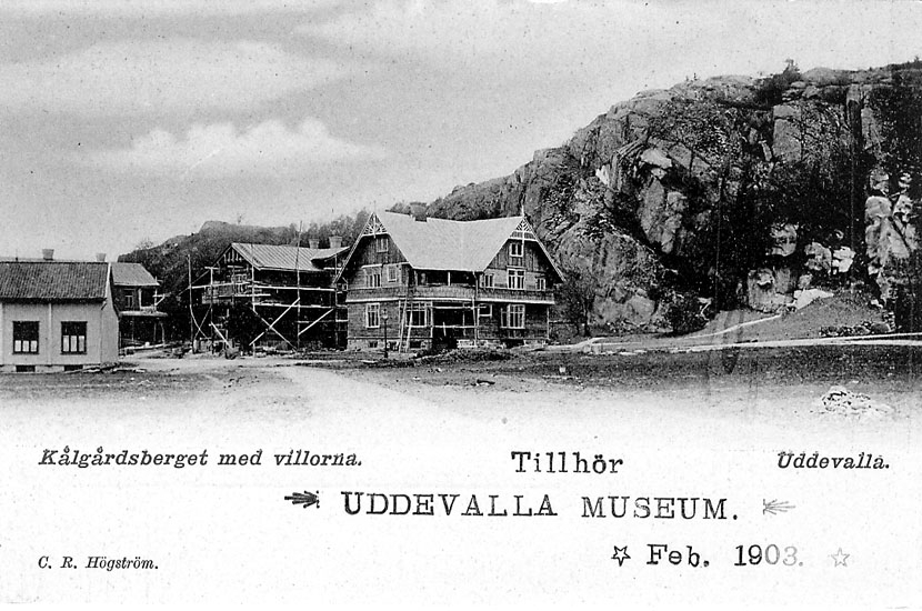 Tryckt text på vykortets framsida: "Kålgårdsberget med villorna Uddevalla".