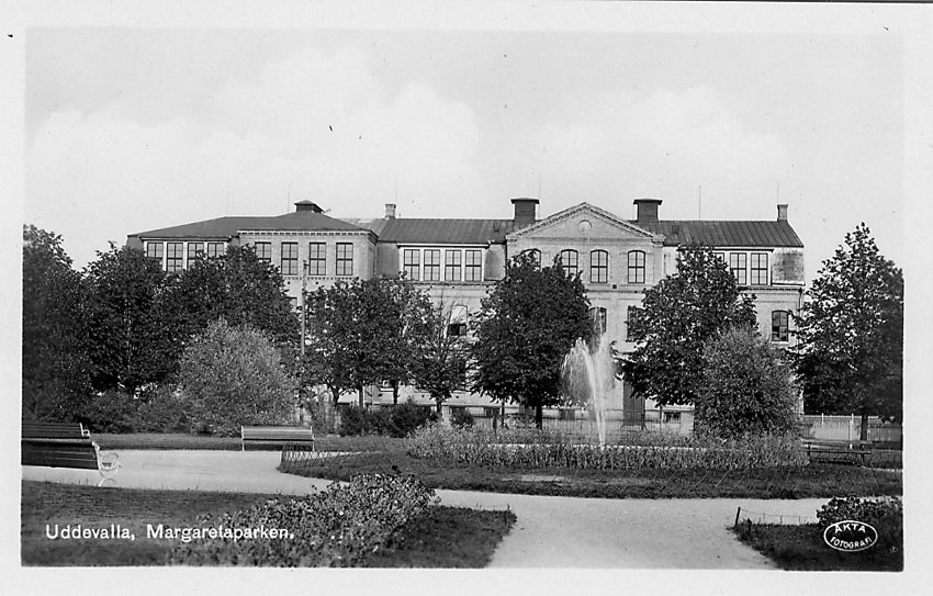 Tryckt text på vykortets framsida: "Uddevalla. Margaretaparken".