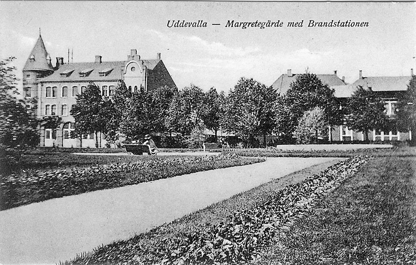 Tryckt text på vykortets framsida: "Uddevalla. Margretegärde med Brandstationen".