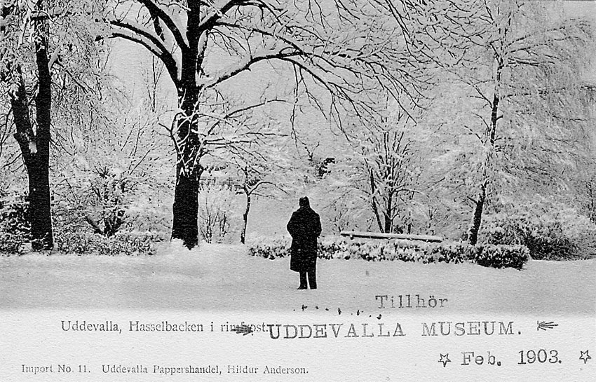Tryckt text på vykortets framsida: "Uddevalla. Hasselbacken i rimfrost".