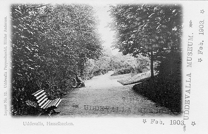 Tryckt text på vykortets framsida: "Uddevalla. Hasselbacken".