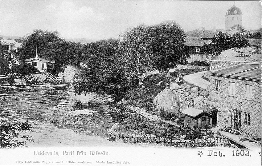 Tryckt text på vykortets framsida: "Uddevalla. Parti från Bäfeån".