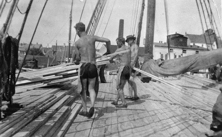 Enl. tidigare noteringar: "Svendborg 1935. Lossning av trälast från fraktskonare.