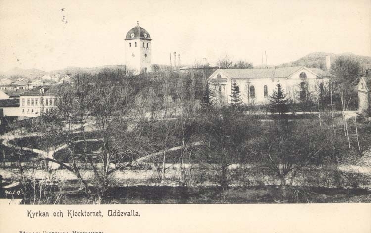 Tryckt text på kortet: "Kyrkan och Klocktornet, Uddevalla. "