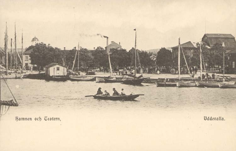 Tryckt text på kortet: "Hamnen och Teatern, Uddevalla. "