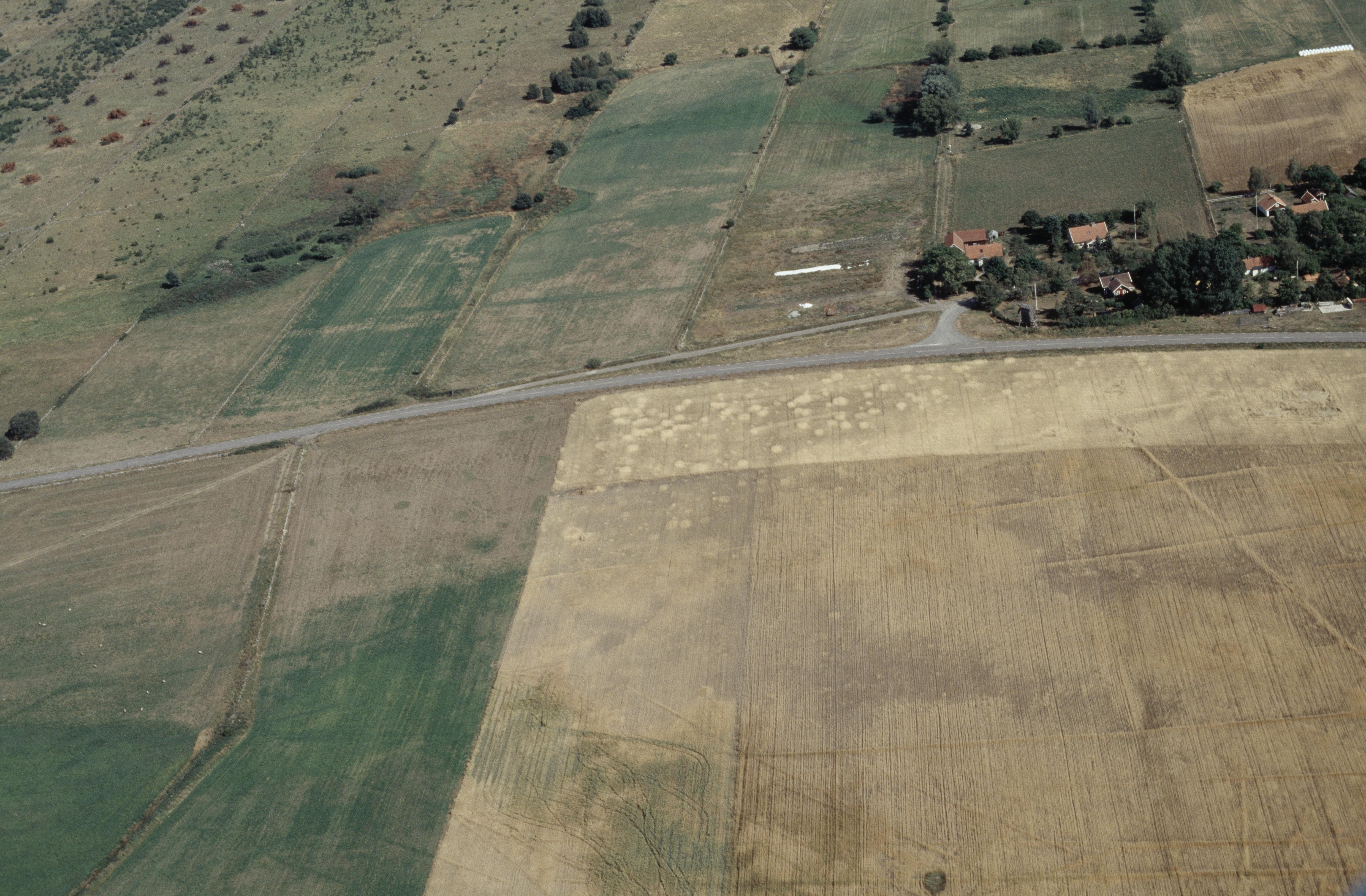 Cropmarks vid väderkvarn norr om kyrkan. Boplats RAÄnr Norra Möckleby 167:1 vid bildens mitt. Bilden är tagen mot (väderstreck): SO