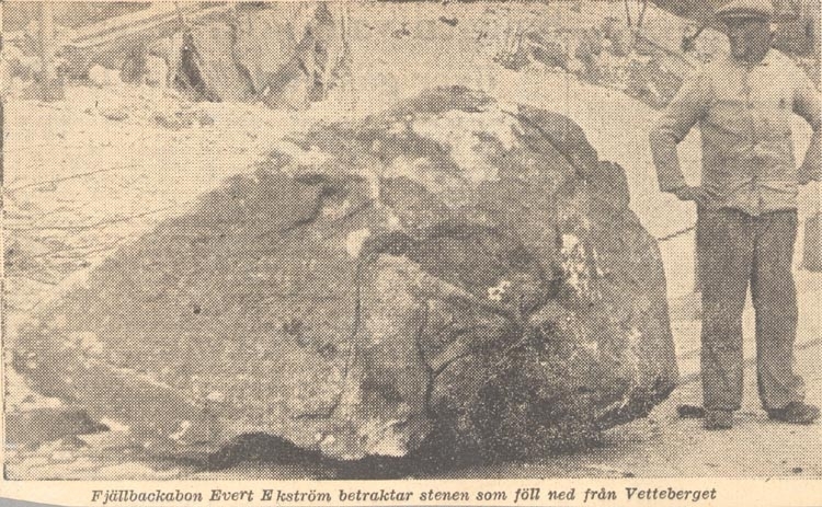 Tryckt text på kortet: "Fjällbackabon Evert Ekström betraktar stenen som föll ned från Vetteberget".
