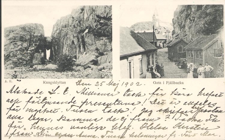 Tryckt text på kortet: "Kungaklyftan. Gata i Fjällbacka".
