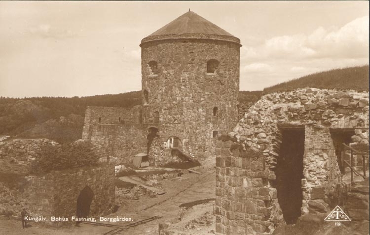 Tryckt text på kortet: "Kungälv. Bohus Fästning Borggården" .