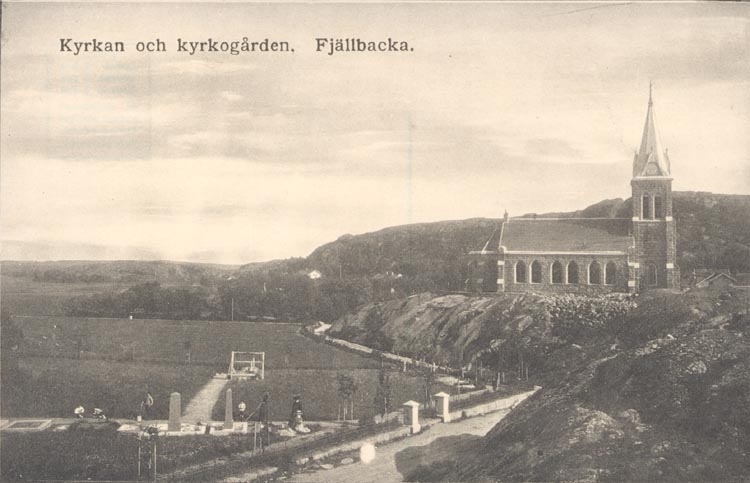 Tryckt text på kortet: "Kyrkan och kyrkogården. Fjällbacka".