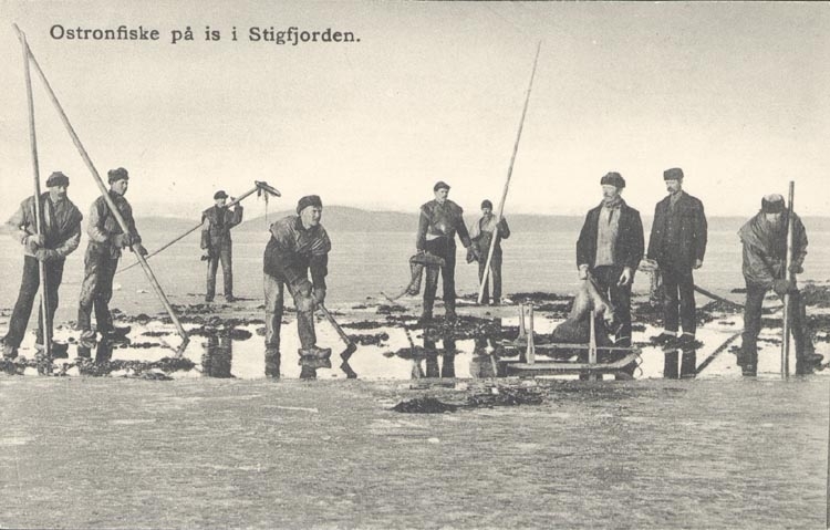 Tryckt text på kortet: "Ostronfiske på is i Stigfjorden".