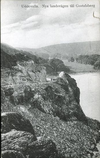 Tryckt text på vykortets framsida: "Uddevalla nya landsvägen till Gustafsberg."