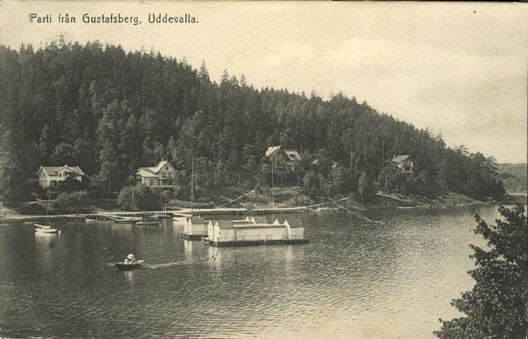 Tryckt text på vykortets framsida: "Parti från Gustafsberg, Uddevalla."