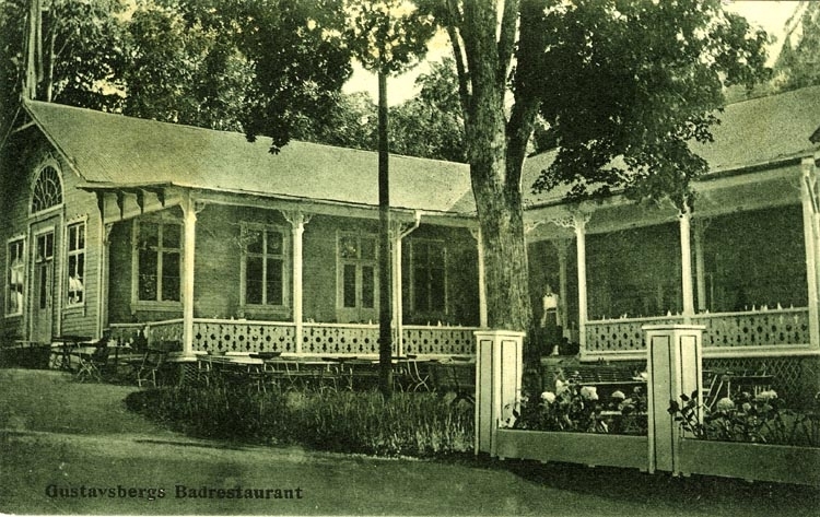 Tryckt text på vykortets framsida: "Gustafsbergs Badrestaurant."