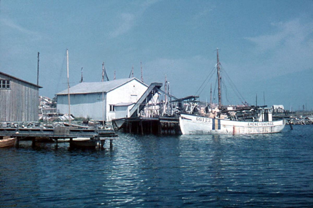 Klova hamn med ishuset, GG123 "Erene" (skeppare Verner Hansson ej med på bild) ligger vid ishuset och skall "isa".