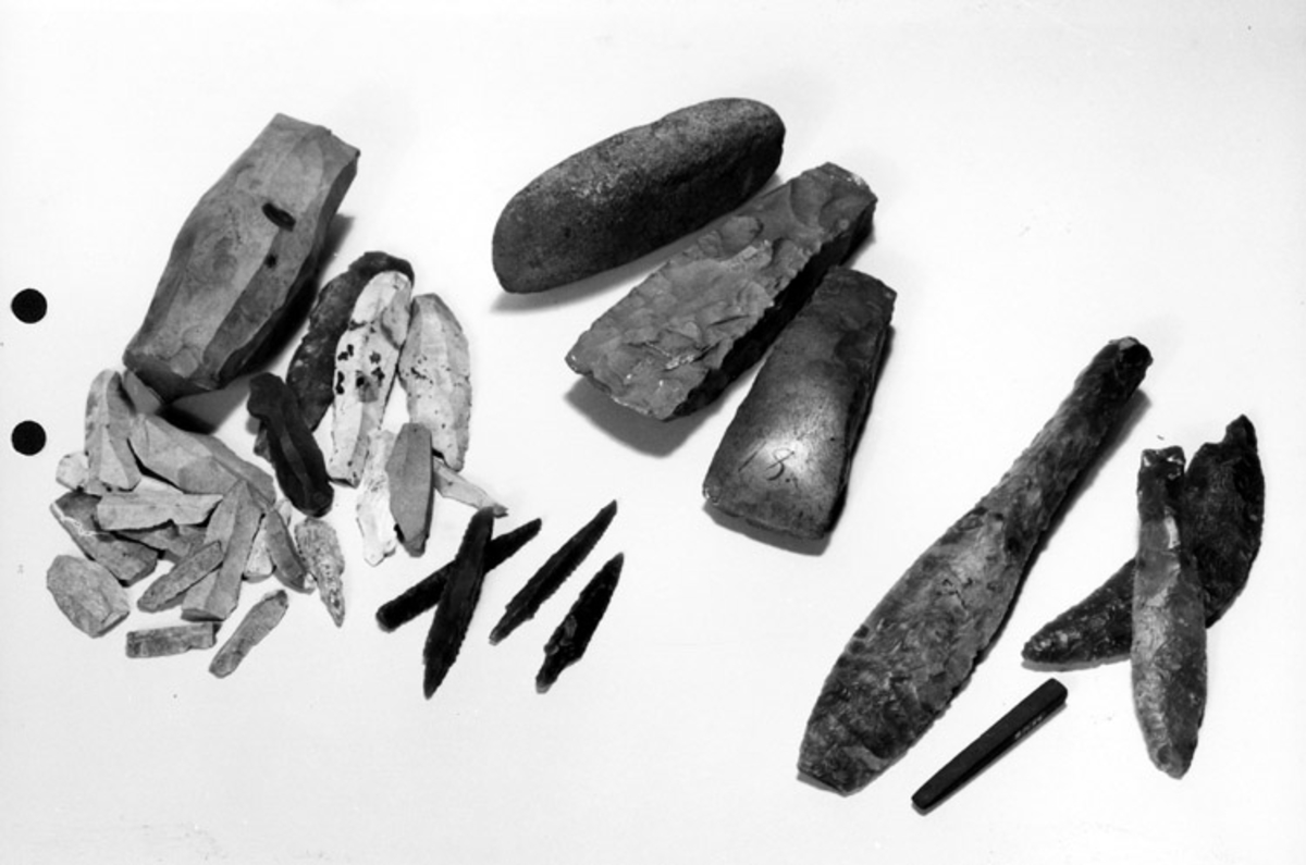Skrivet på baksidan: Stenåldersredskap från fyndplats på Sotenäs.