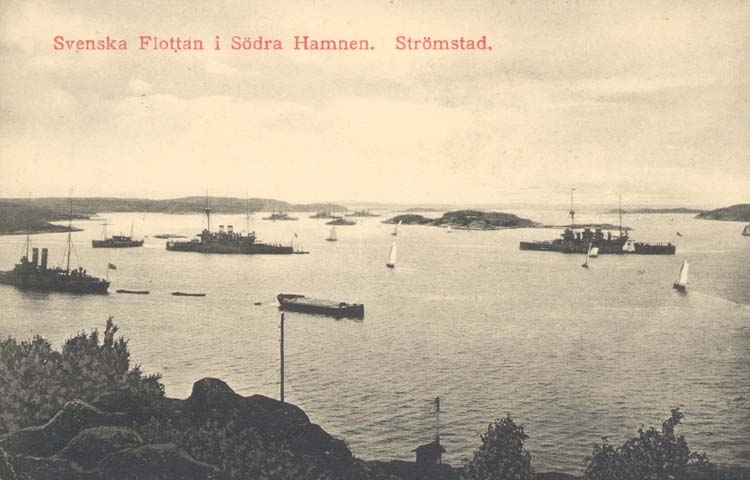 Tryckt text på kortet: "Svenska Flottan i Södra Hamnen. Strömstad."