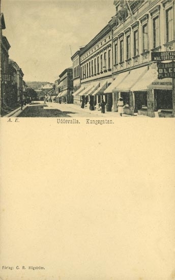 Tryckt text på vykortets framsida: "A.E. Uddevalla Kungsgatan."