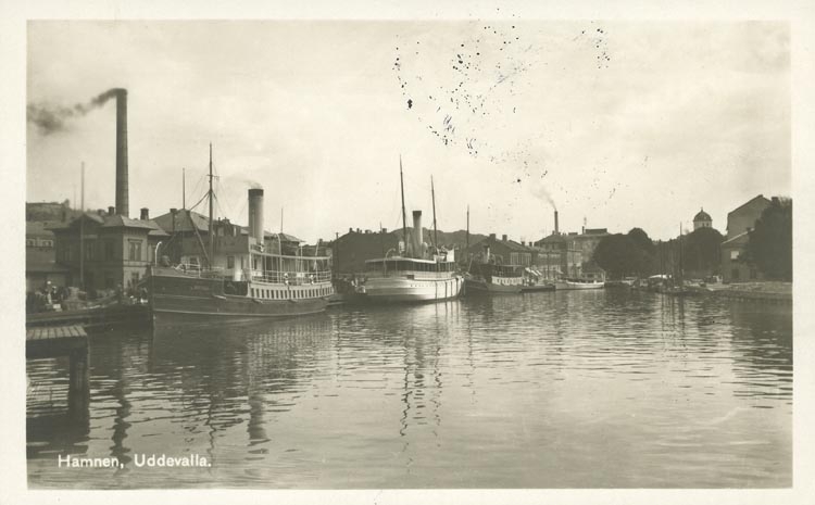Tryckt text på vykortets framsida: "Hamnen, Uddevalla."