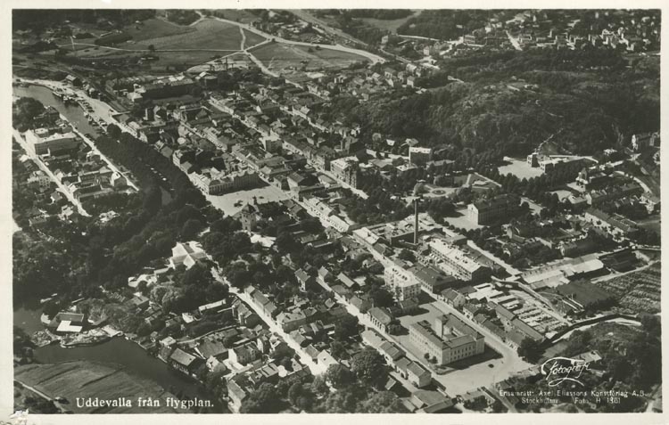 Tryckt text på vykortets framsida: "Uddevalla från flygplan."