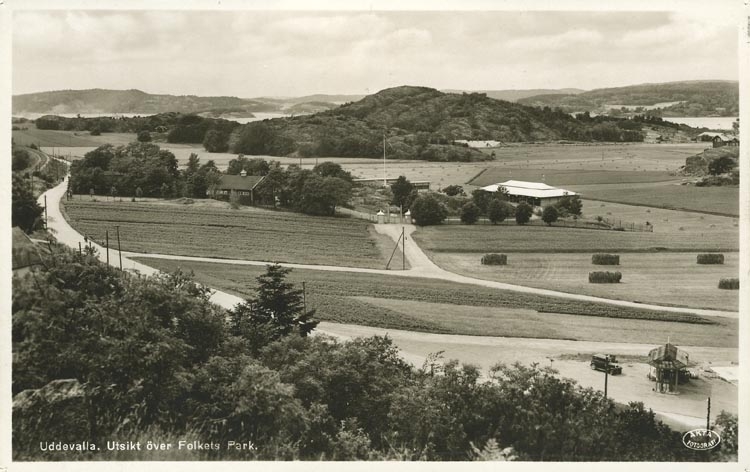 Tryckt text på vykortets framsida: "Uddevalla. Utsikt över Folkets Park."
