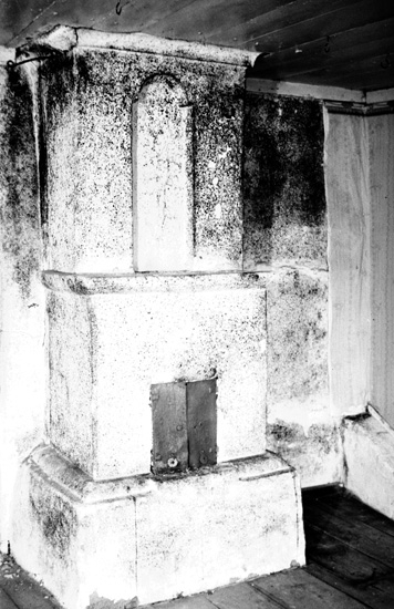 Text till bilden: "Dalslandstugan före flyttning, kakelugn".